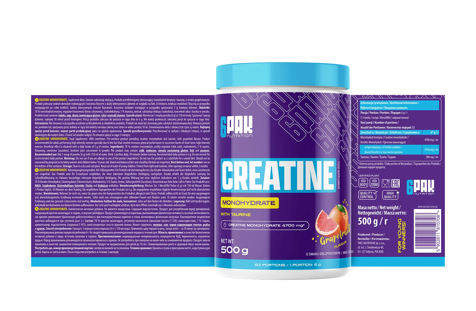 Składniki: 78 % monohydrat kreatyny, regulator kwasowości (kwas cytrynowy), maltodekstryna, 5 % tauryna, aromat, substancja słodząca (sukraloza), koncentrat soku z buraka w proszku.