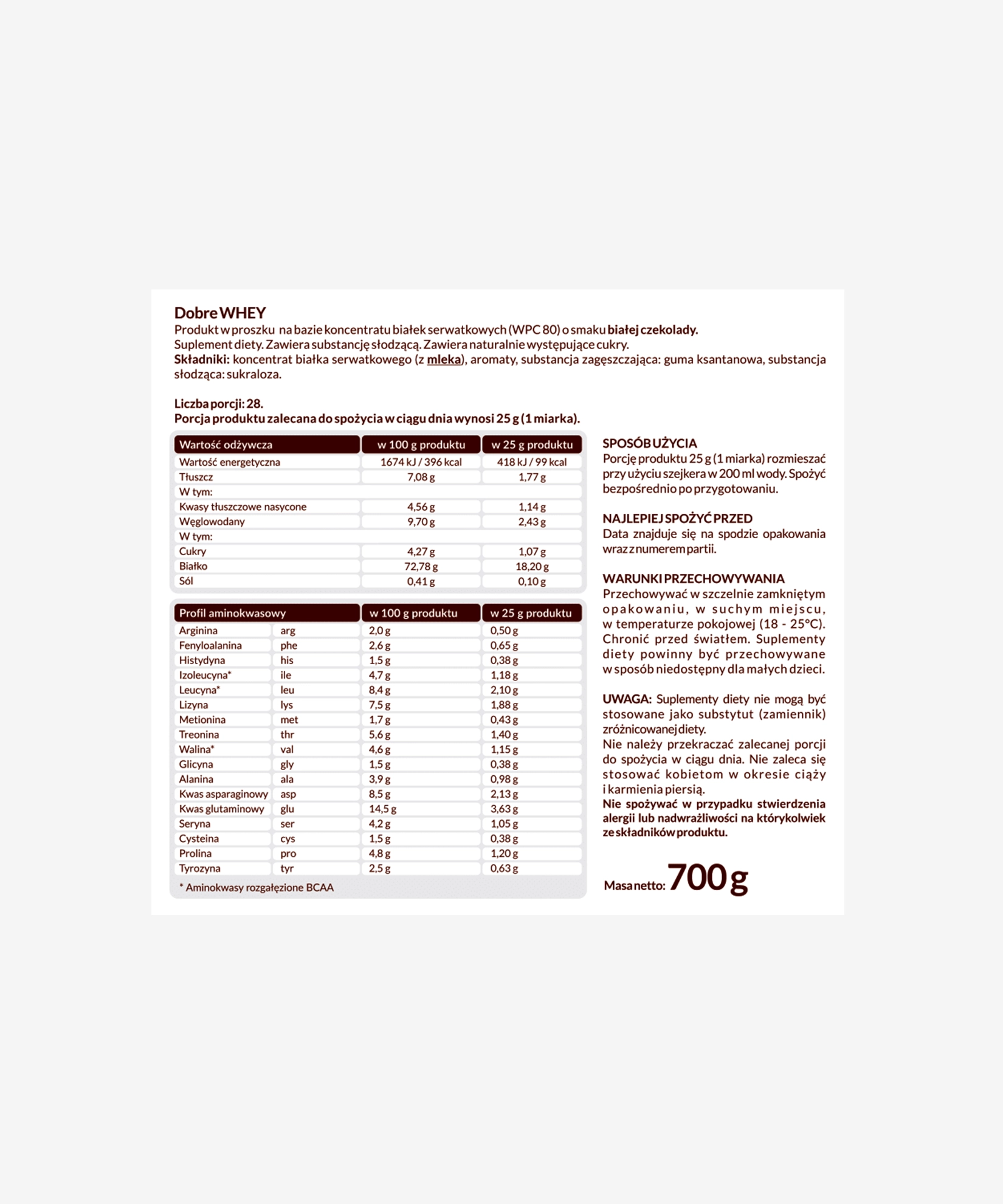 Formuła oparta na starannie dobranym białku serwatkowym charakteryzuje się wysoką biodostępnością, dzięki czemu aminokwasy są szybko i efektywnie wykorzystywane przez organizm. Każda porcja pomaga w utrzymaniu i rozwoju masy mięśniowej, a także wspiera regenerację po intensywnym treningu.