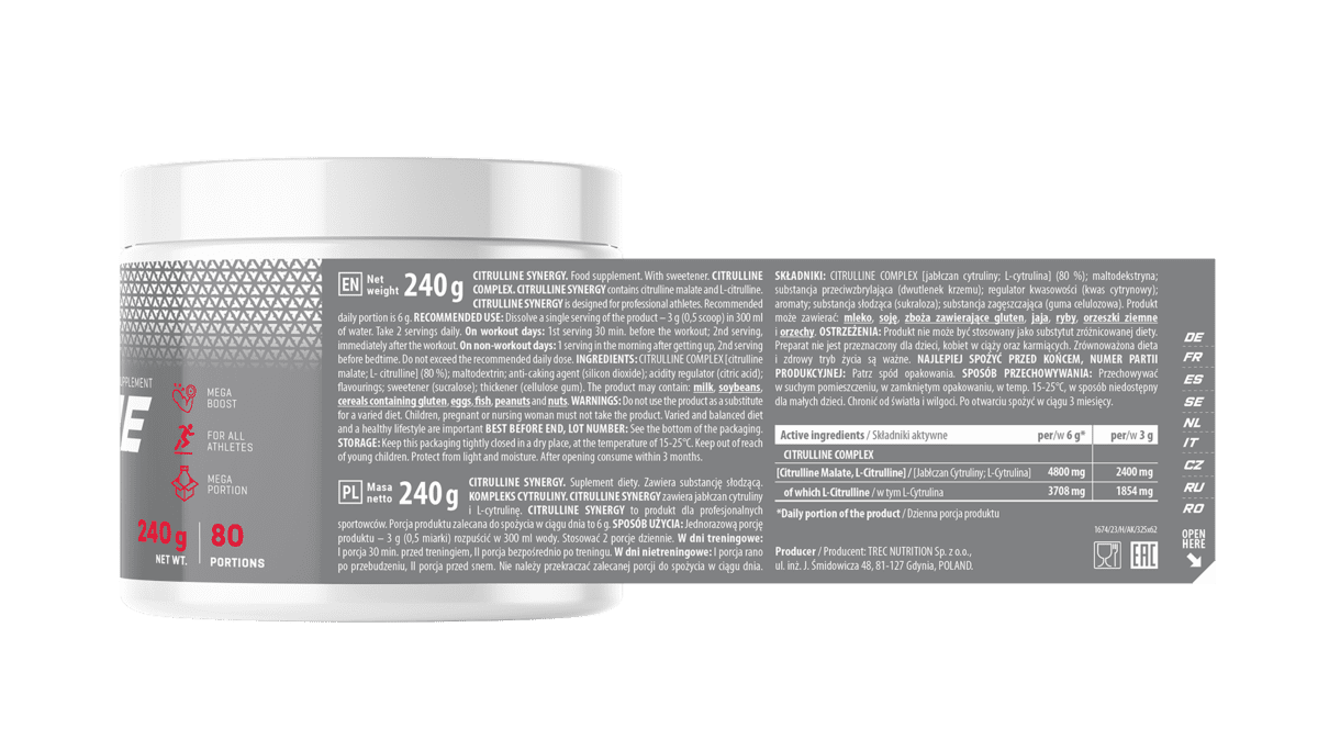 80 % CITRULLINE COMPLEX [jabłczan cytruliny, L-cytrulina)], maltodekstryna, substancja przeciwzbrylająca (dwutlenek krzemu), regulator kwasowości (kwas cytrynowy), aromaty, substancja słodząca (sukraloza), substancja zagęszczająca (guma celulozowa). Produkt może zawierać: mleko, soję, zboża zawierające gluten, ryby, mięczaki i orzeszki ziemne.
