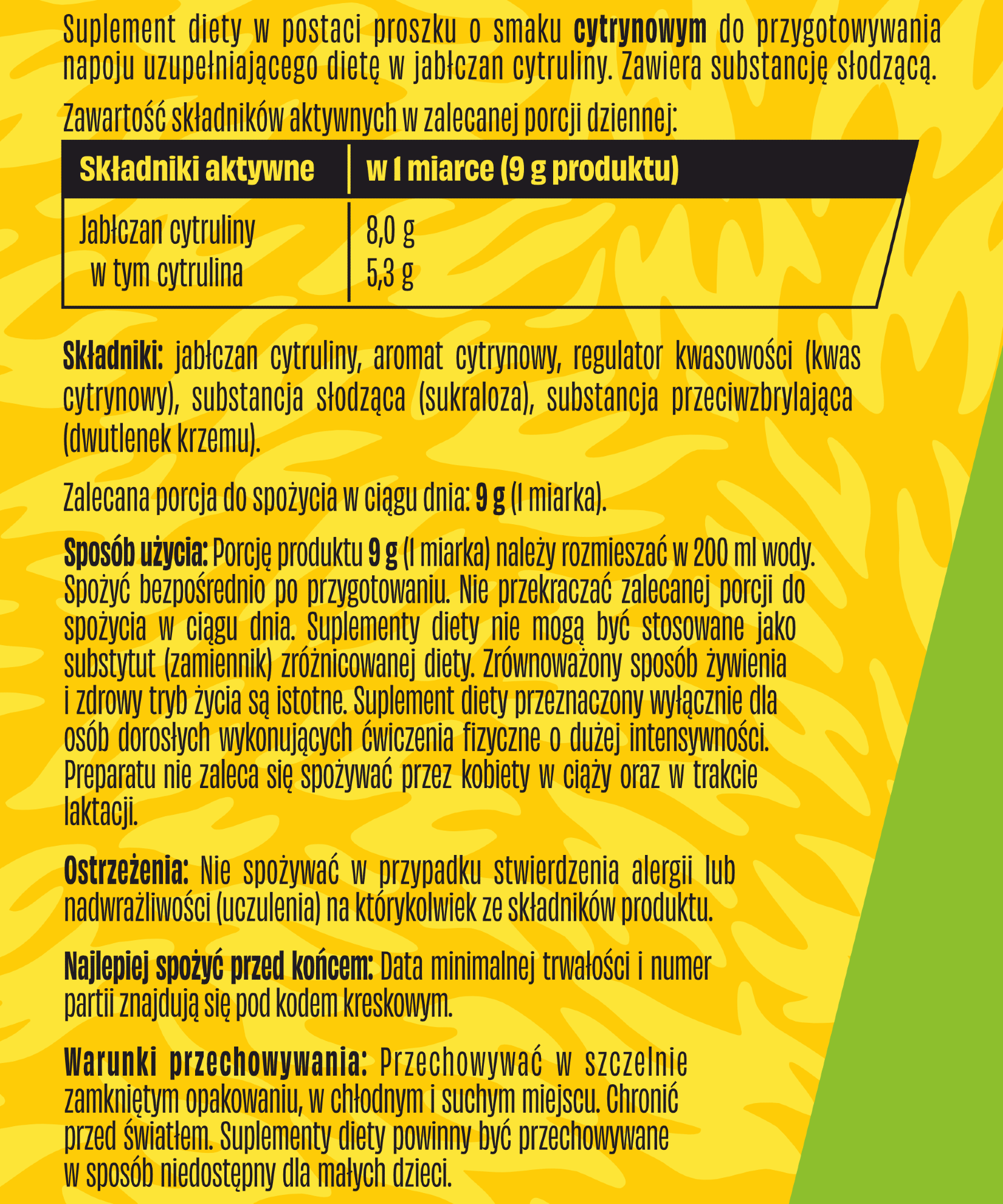 Każde opakowanie zawiera 540 g suplementu, czyli 60 porcji. Przy treningach 3-4 razy w tygodniu wystarcza nawet na 4 miesiące suplementacji. Smak lemon (cytryna) zapewnia orzeźwienie i doskonałą rozpuszczalność.