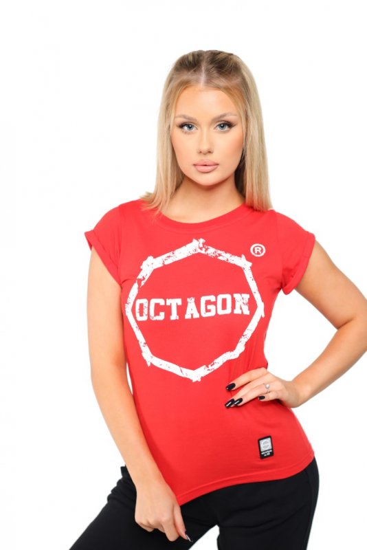 T-shirt damski Octagon Logo Smash red to połączenie kobiecego stylu z bezkompromisową energią marki OCTAGON. Intensywny czerwony kolor i dynamiczny nadruk Logo Smash sprawiają, że koszulka natychmiast przyciąga uwagę i podkreśla silny, niezależny charakter właścicielki.